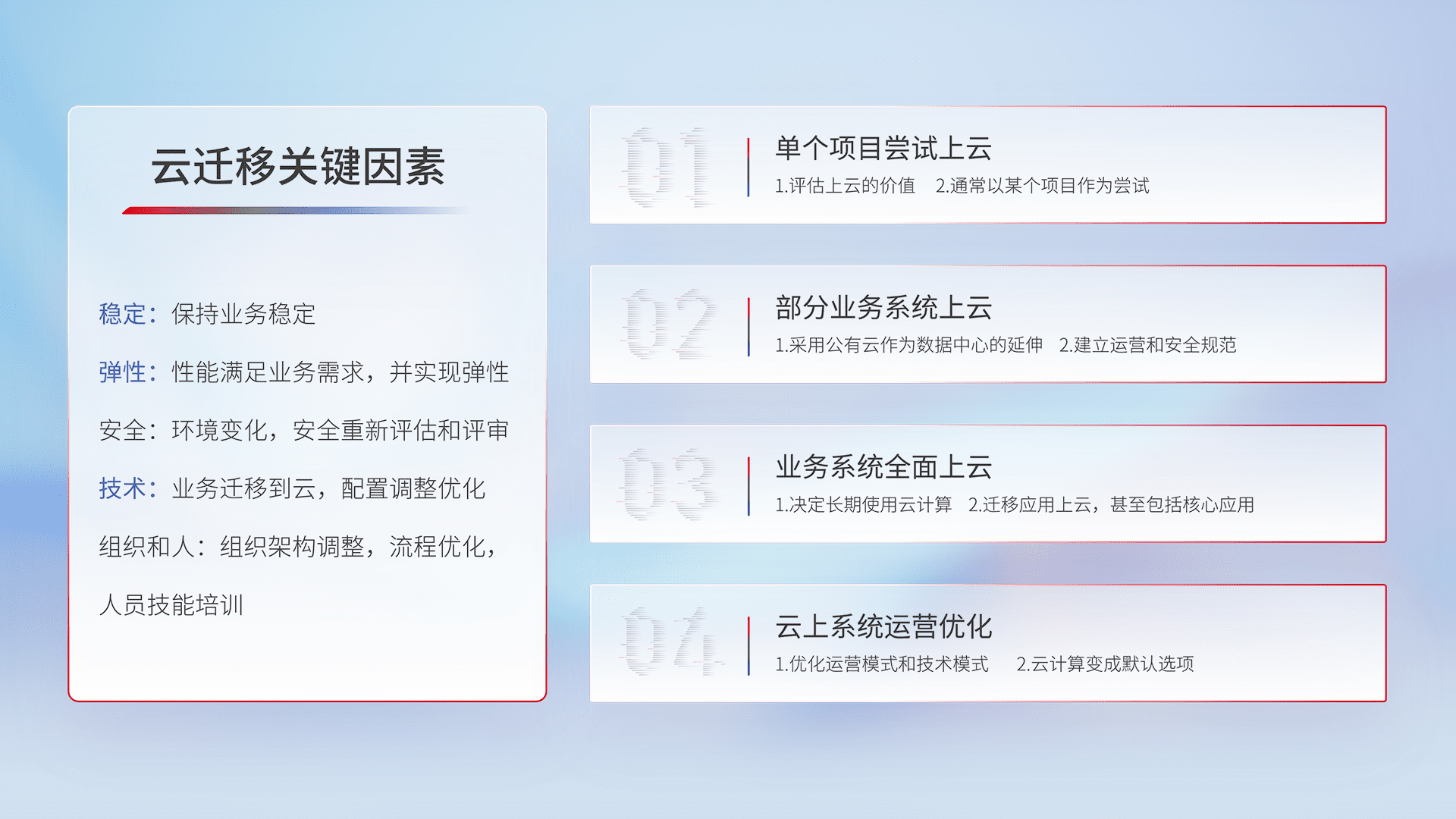 结合实际业务,,,,从规划设计、、、、云平台选型、、云原生改造、、、数据迁移、、集成交付,,迁移全过程为客户识别最佳上云路径,,,,做好风险识别管理,,设计网络架构、、身份权限、、、安全审计合规、、操作审计、、、、日志审计、、、、监控告警策略、、、多站点容灾设计等,,,,对云上基础设施进行整体规划,,,,提升IT治理水平,,以满足弹性、、、、高可用、、高性能的需求。。。