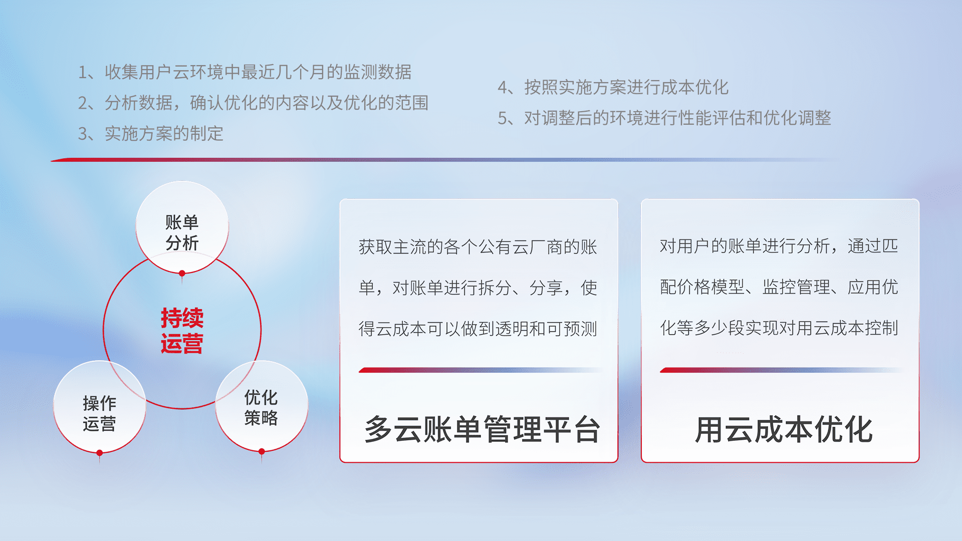 通过多云纳管,,以统一的资源数据模型把客户的云资源进行抽象和封装,,进而实现对多云资源的统一操作,,,保障云资源管理的可靠性、、、、稳定性与可用性。。。量身定制化运维内容,,,,配置、、开发运维、、、补丁管理、、、、备份、、、、监控、、、、认证和访问管理、、、、审计和日常巡检等,,,保障在用云过程中的可靠度,,,稳定度以及高可用率。。。。